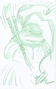 Original drawing done in ink and gray markers with white painted details. Green pencil sketch of Leonardo on the back cover.